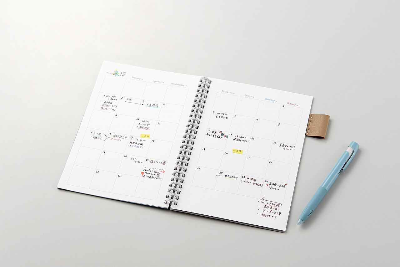 ツイストノートはルーズリーフとは穴の規格が異なります。リーフは、ツイストノートの専用リフィルを使います。A5サイズは7種類、A6サイズは6種類あります。リングノートは紙面がフラットで書きやすく、折り返せば半分サイズにもなるので省スペースで使えるのがポイントです。A5サイズは写真のようにマンスリーリフィルもあるのでスケジュール管理にも最適です。