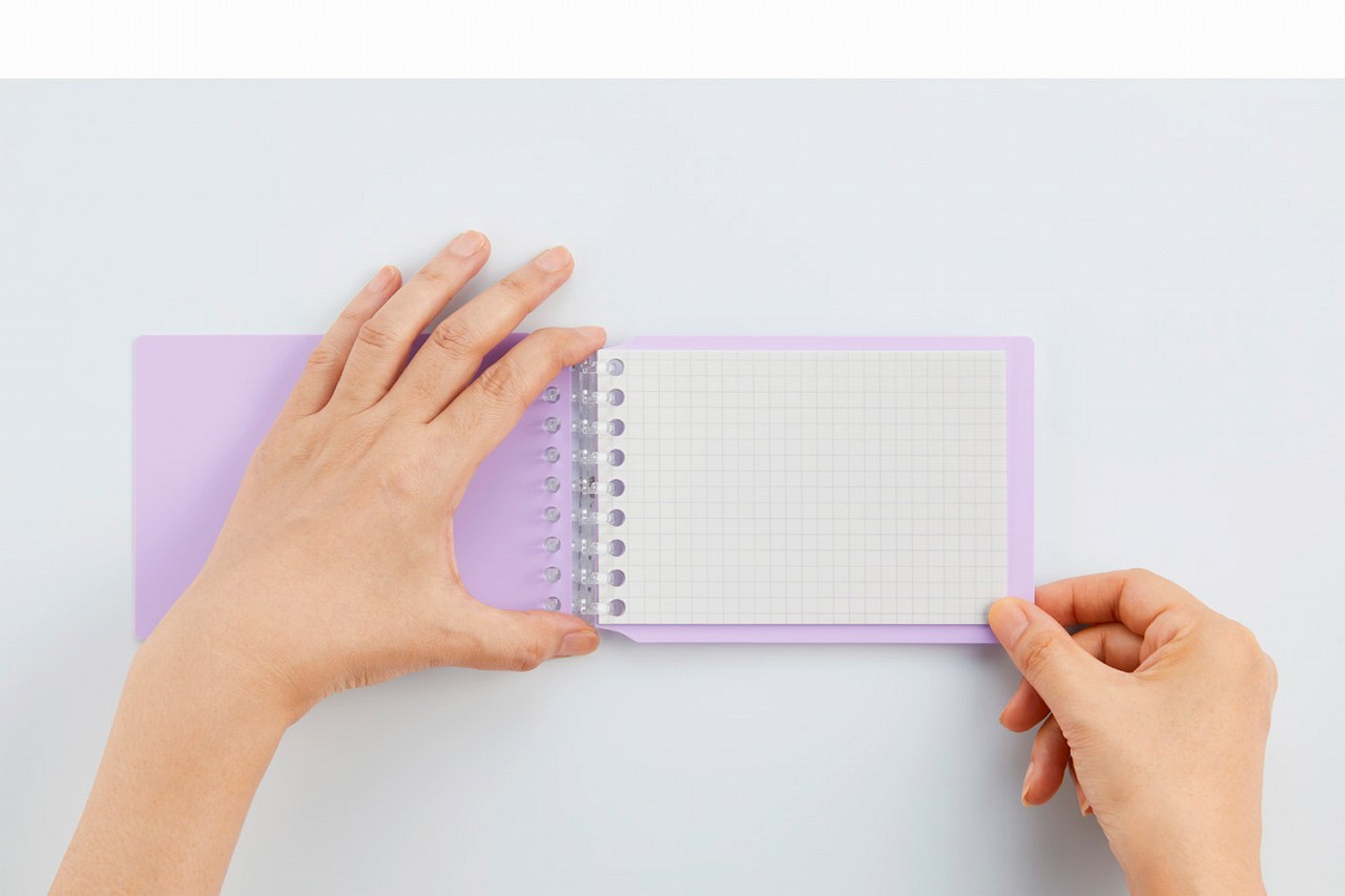開け方はリングの両端を押して、表紙を引っ張るだけなのでとても簡単です。リングを押しただけでは開かないので、カバンの中で中身がばらける心配はありません。1冊で収納枚数は約50枚入るので用途を分けて使ったり、持ち運びにも便利なので仕事や習い事など外出先でも使いやすいミニノートです。