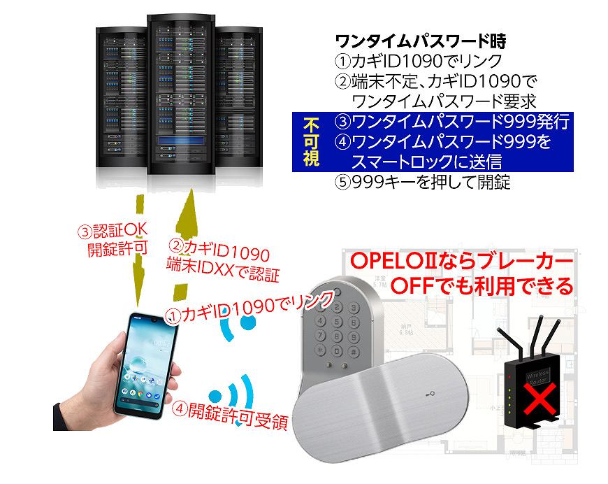 ルーターがなくても開錠時にロック本体とスマホ、スマホとサーバが通信することで、その場でワインタイムキーをロックに送信。スマホには暗証番号が表示されるので、番号を入力すると開錠できる