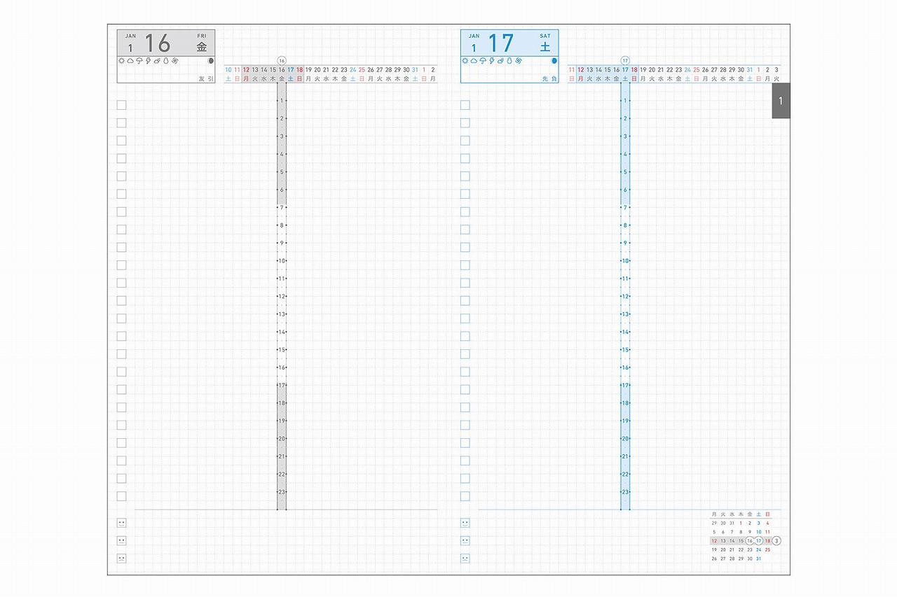 縦軸に24時間軸、横軸に前後の日付と曜日を配した独自のフォーマット「T型タイムライン」が特長の手帳です。1日1ページなのでたっぷり書き込めます。「仕事とプライベート」、「本業と副業」といった異なる情報をページの左右に書き分けられるのがポイント。ページの左側にはTODOリストがあるので、その日のタスクを書き出すこともできます。
