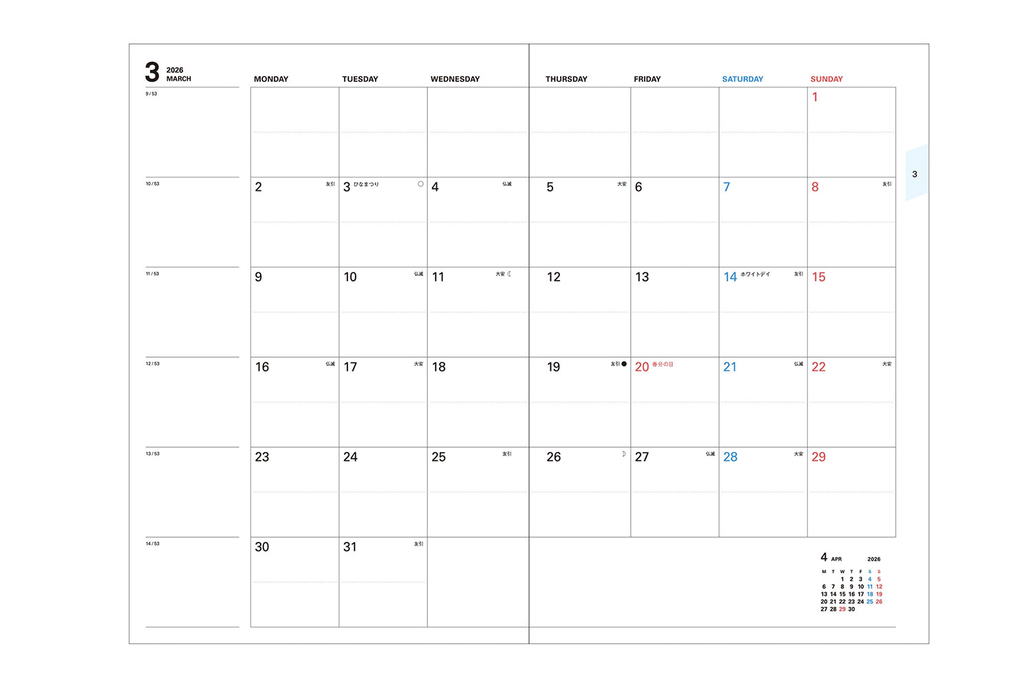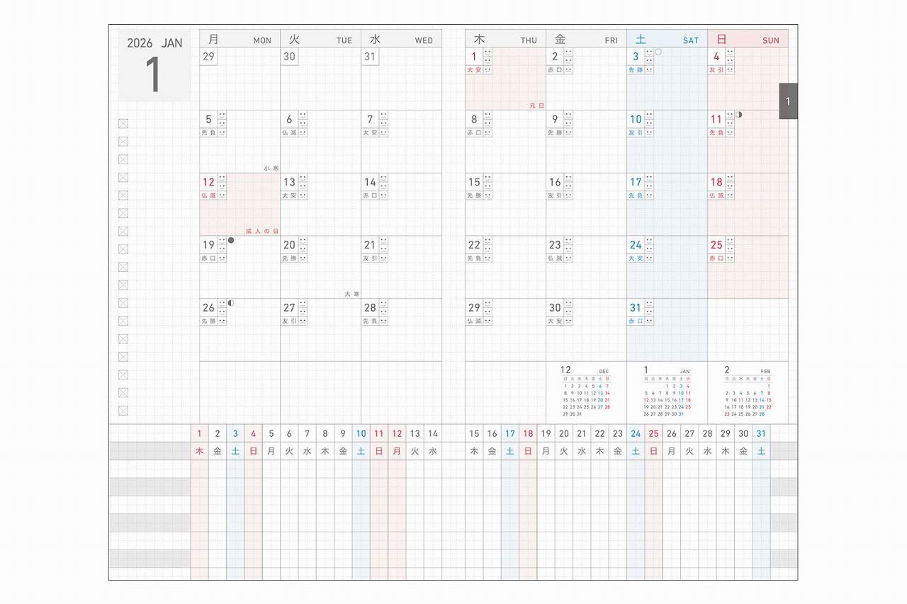1ヵ月の予定を俯瞰で把握しやすい「マンスリーページ」。1マスの中心には上下の区切り線があるので、午前・午後の予定や仕事とプライベートの予定など書き分けられるのがポイント。週の始めには、ウィークリーメモ用の1マスも付いているので1週間の目標や、ちょっとしたメモに最適です。