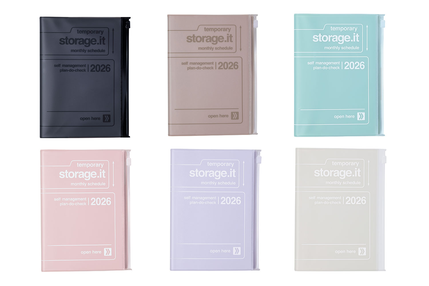 「ストレージイット 2026年版手帳 月間ブロック B6変型」は、シーンを選ばず長く愛されてきたシンプルなカバーデザインなのでビジネスシーンでも安心して使えます。2026年は落ち着いたブラウンとやわらかなピンクの新色が仲間入り。他にも表紙のデザインが豊富で「OSAMU GOODS(オサムグッズ)」や、韓国生まれのゆるかわキャラクター「ブランチブラザー」などコラボデザインも人気を集めています。