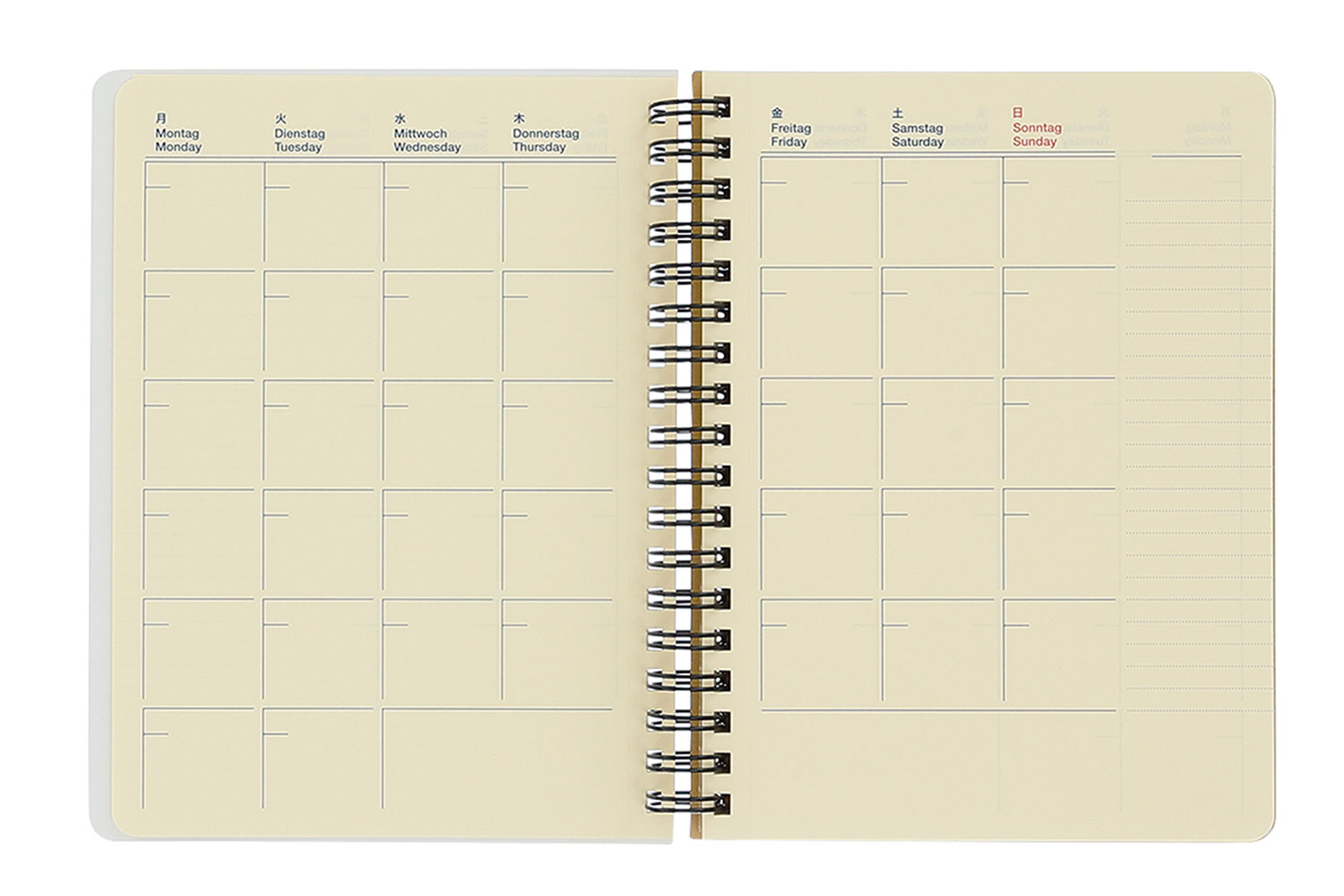月と日付を書き込んで使う「マンスリーページ」見開き1ヵ月の計12ヶ月分使えます。右のページの日曜日の隣がメモスペースになっているのでその月のTODOリストや、イベントメモにも使えます。