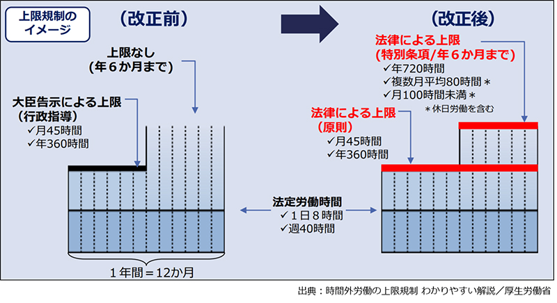 また、「特別条項」の①が時間外労働の時間数だけの基準であるのに対して、②と③は時間外労働と休日労働の時間数を合算した基準になっている。新旧制度を比較すると、下図のとおりである。