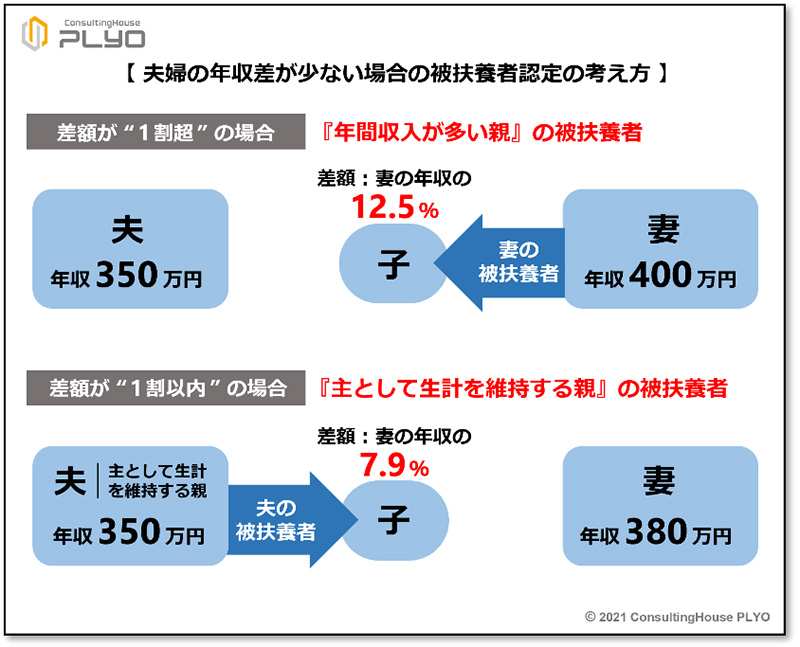 また、年間収入が夫は350万円、妻は380万円のケースであれば、年間収入の差額である30万円(=妻380万円-夫350万円)は、年間収入が多い妻の年収の約7.9%(≒30万円÷妻380万円×100)である。この場合には、差額が“1 割以内”なので上記②に該当し、子供は『主として生計を維持する親』の被扶養者とされる。そのため、年間収入が多いのは妻だが、『主として生計を維持する親』が夫なのであれば、届け出ることにより子供は夫の被扶養者とされることになる。
