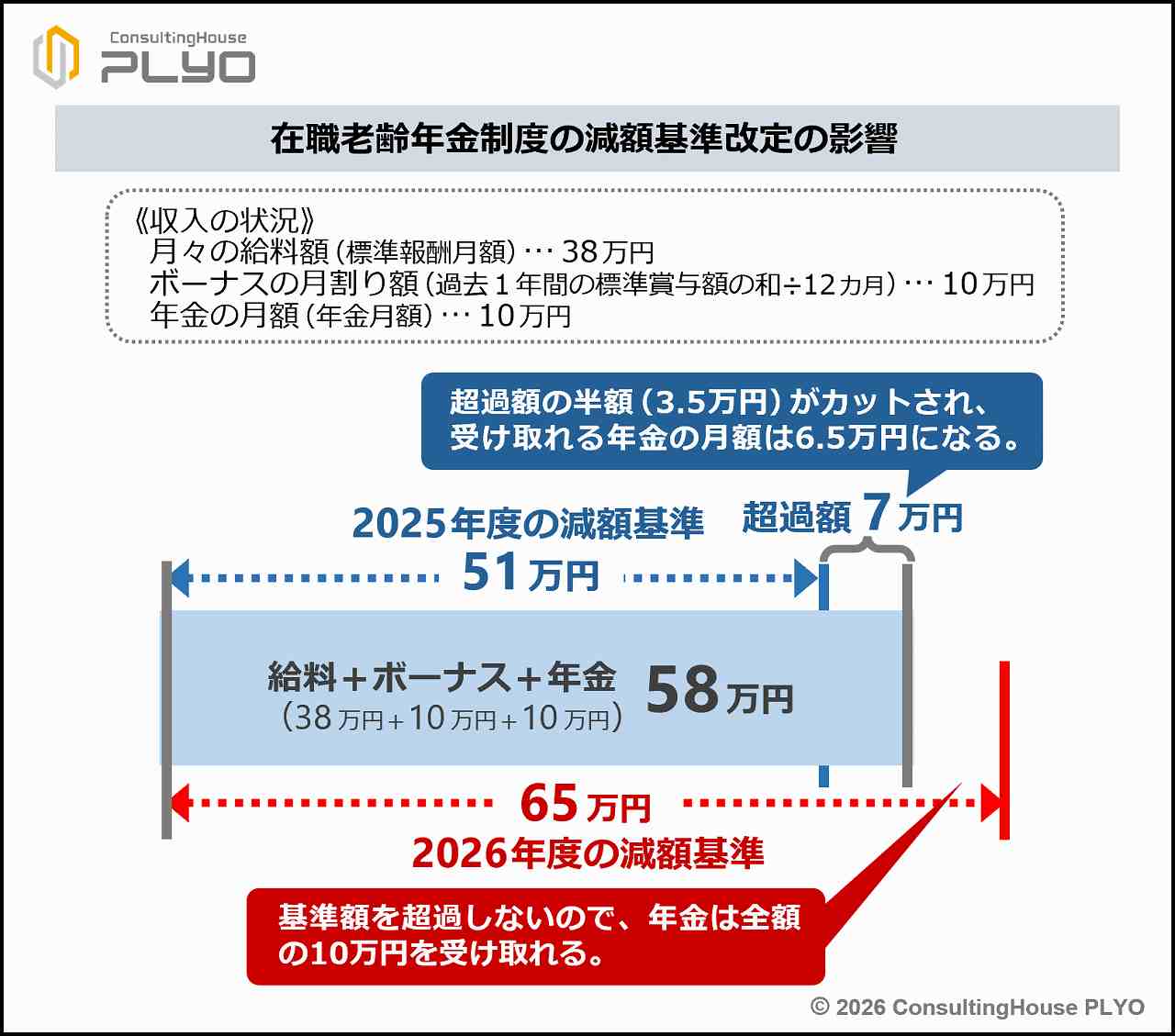 2026(令和8)年度であればどうだろうか。新しい減額基準は65万円なので、3つの数値の和である58万円は基準額内に収まっている。従って、このシニア社員は従前どおり勤務しても、月10万円の年金がそのまま受け取れるわけだ。(下図参照)