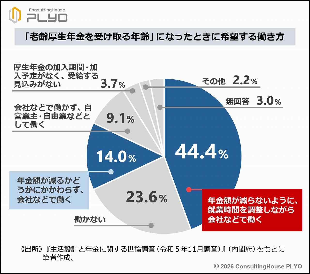 現在、老齢厚生年金を受け取る年齢になったら「年金額が減らないように、就業時間を調整しながら会社などで働く」と考える人材の割合は非常に多く、44.4%に上る。(生活設計と年金に関する世論調査(令和5年11月調査)/内閣府)