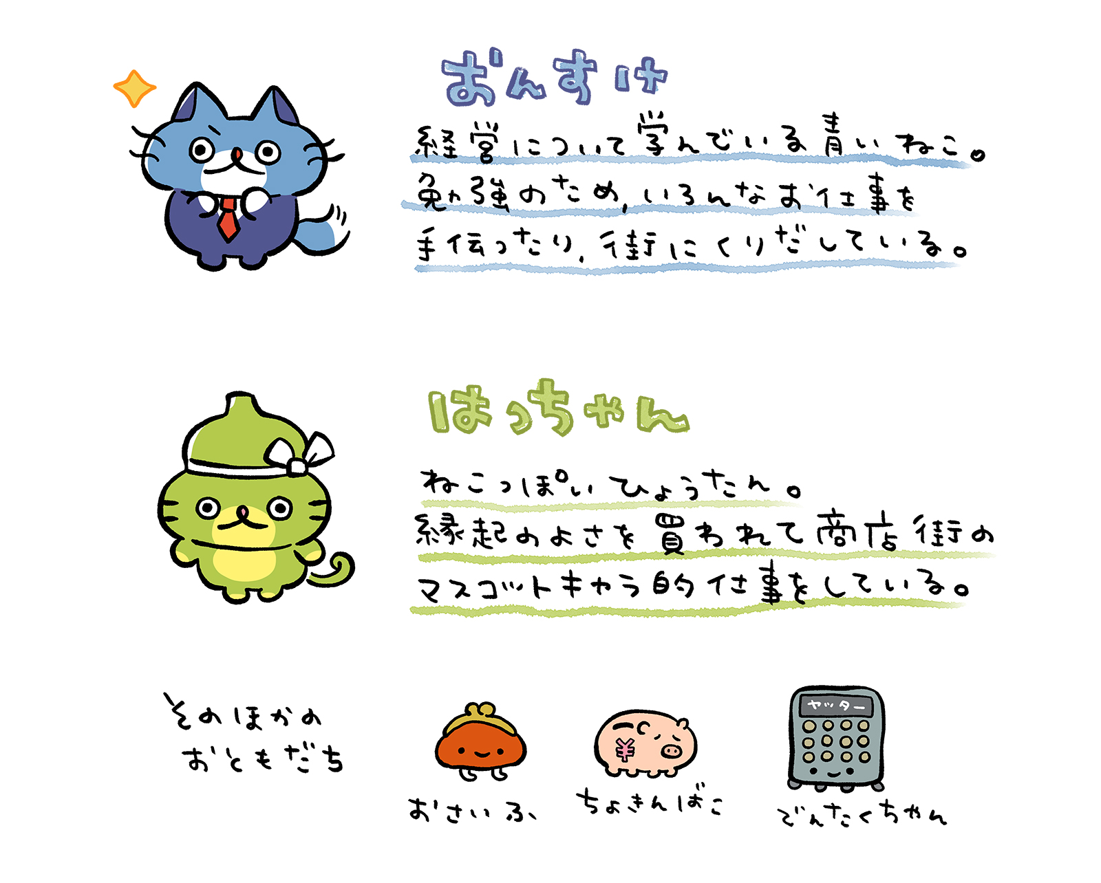 LINEスタンプなどで活躍する高橋きのさんに「みんなの経営応援通信」キャラクターを制作して頂きました。高橋さんは「ねこのぶーちゃん」というキャラクターで人気を集める、いま大人気のクリエイターです。