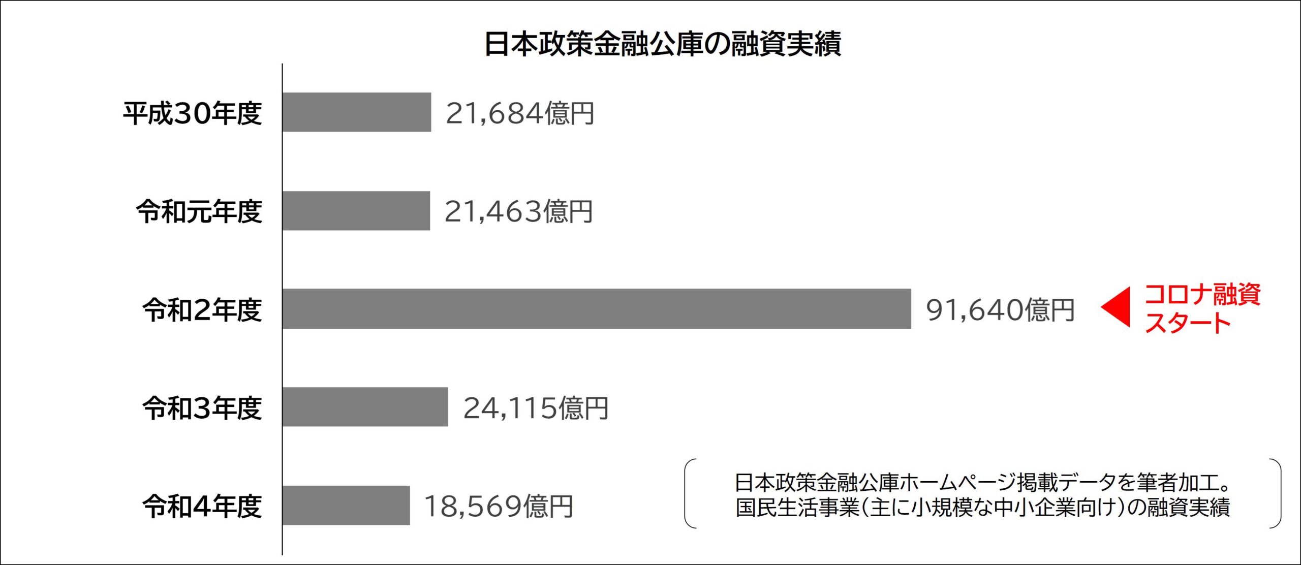 いずれもコロナ禍の影響を受けた事業者を対象にしたもので、利子負担が軽い、平時に比べると審査のハードルが低い、等の特徴があり、その筆頭が実質無利子・無担保の融資です。利子もゼロ、担保もゼロなので通称「ゼロゼロ融資」と呼ばれますが、平時には考えられない条件です。ゼロゼロ融資は日本政策金融公庫、民間金融機関ともに実施していました。このゼロゼロ融資をはじめとするコロナ融資を多くの事業者が活用しました。実際、日本政策金融公庫が公表している融資実績(下図)を見ると、コロナ禍が始まった2020年度(令和2年度)の融資実績は突出しています。