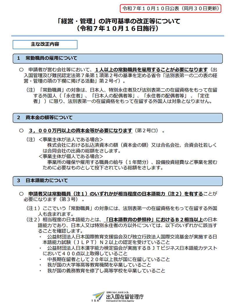 令和7年10月16日、在留資格「経営・管理」の許可基準が大幅に改正されました。