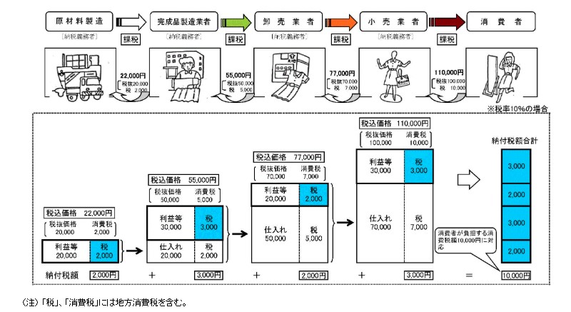 各段階における売上と仕入は対応しており、標準税率10%と軽減税率8%が混在する複数税率制度においては、不正やミスを防止するために正確な税率と税額の確認が必要となります。