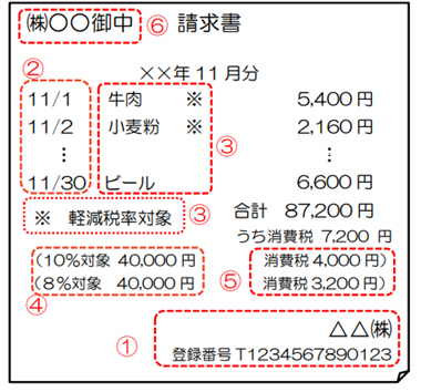 [1] 次の記載された請求書等をいう。①発行者の氏名又は名称②取引年月日③取引の内容④受領者の氏名又は名称⑤軽減税率の対象である旨⑥税率ごとに区分した合計額。