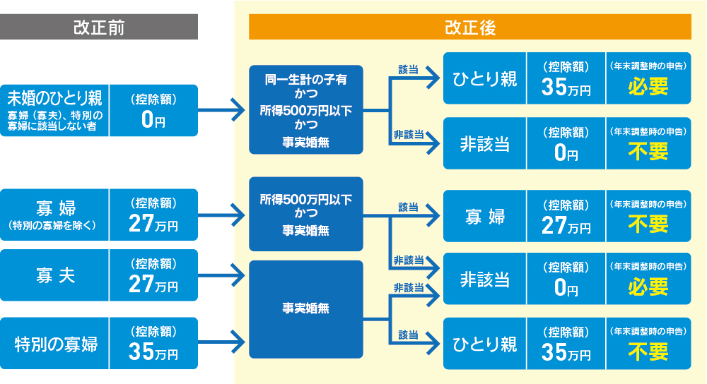 (注)改正前の「寡婦(特別の寡婦を除く)」に該当する人が、上記適用判定の結果、「寡婦」に該当する場合において、その人と生計を一にする子を有するときは、「ひとり親」(控除額:35万円)に該当し、年末調整の際にその異動内容について申告する必要があります。