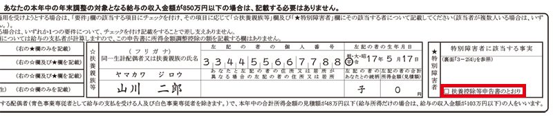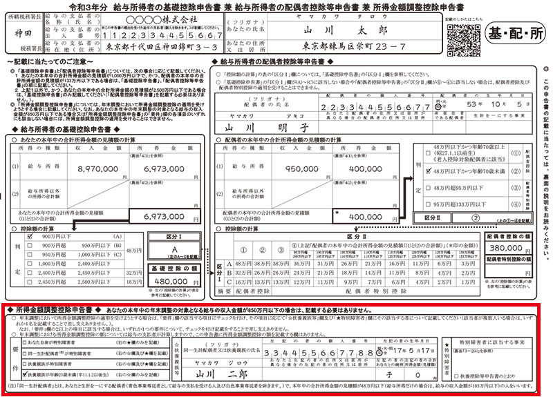 また、「給与所得者の基礎控除申告書兼給与所得者の配偶者控除等申告書兼所得金額調整控除申告書」における「所得金額調整控除申告書」欄について、「★特別障害者」欄の特別障害者に該当する者が「給与所得者の扶養控除等申告書」に記載している特別障害者と同一の場合には、従来は該当事実または扶養控除等申告書のとおりである旨を記入しなければならなかったところ、令和3年分からは「□(チェック)」欄に「✓」の記入だけでよいことになりました。