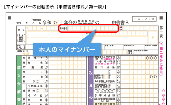 マイナンバーは確定申告の際に必要になります。平成28年の運用開始以降、確定申告書にマイナンバーを記載して提出することになりました。例えば所得税等の確定申告書B様式第一表には、以下のように本人のマイナンバー記載欄があります