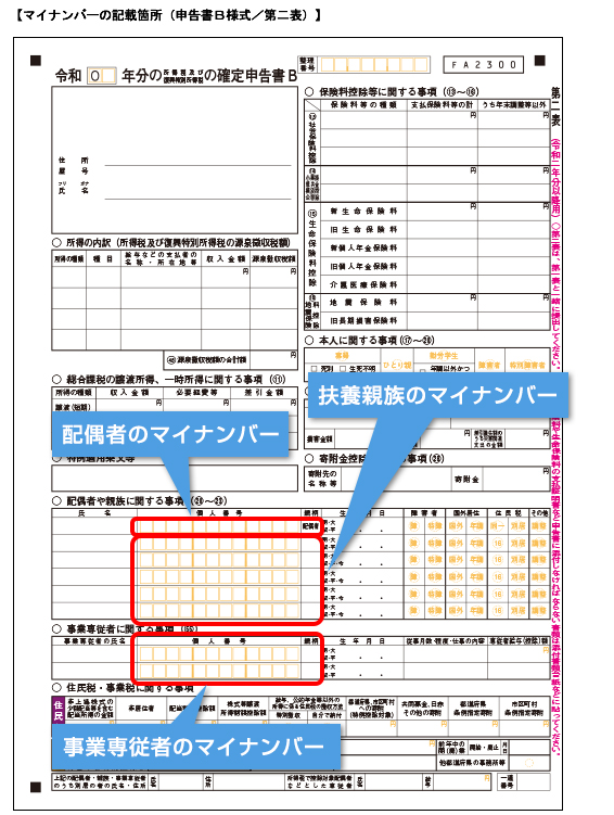 また、所得税等の確定申告書B様式第二表には、下の図のように配偶者・扶養親族・事業専従者のマイナンバーを記載する必要があります