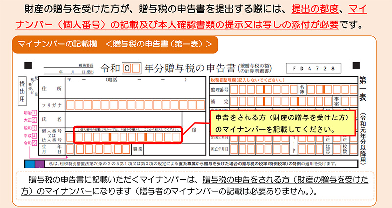 財産の贈与を受けた方が、贈与税の申告をする際にもマイナンバーが必要です。この場合、必要なのは申告する方(贈与を受けた方)のマイナンバーであり、贈与を行った方のマイナンバーは不要です。また、相続税の申告の際にも、申告する方(相続を受けた方)のマイナンバーを記載する必要があります。ただし、被相続人(亡くなった方)のマイナンバーは記載不要です。