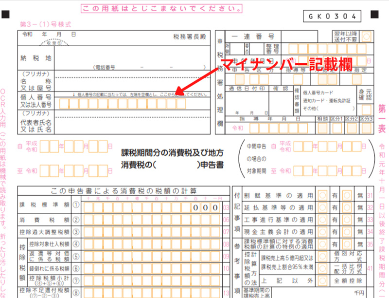 消費税及び地方消費税の申告書にも、マイナンバーを記載する必要があります。例えば「消費税及び地方消費税の申告書(一般用)」には、下の図のようにマイナンバーの記載欄があります