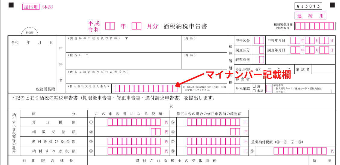 酒税や間接諸税の申告の際にもマイナンバーが必要です。例えば酒税納税申告書には、下の図のようにマイナンバーの記載欄があります
