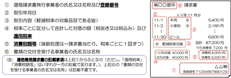 インボイス制度の正式名称は「適格請求書等保存方式」です。制度開始後、仕入先からもらった請求書や領収書が次の6つの事項が書かれたインボイス(適格請求書)の形式でないと、消費税の支払分を預かり消費税から引けなくなります。