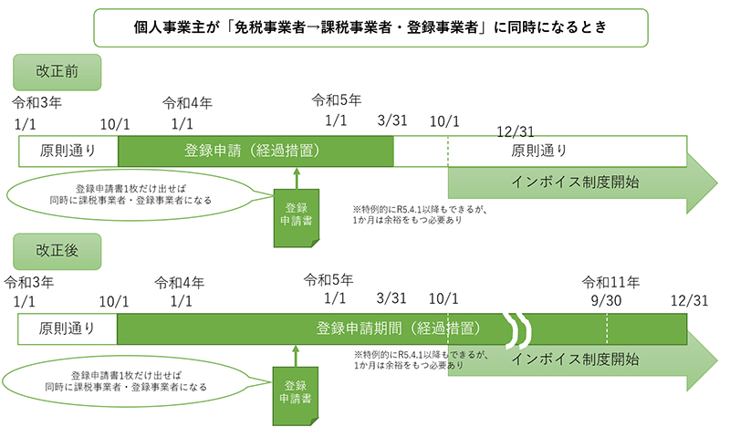 そこで、今回の改正により「令和5年10月1日から令和11年9月30日までの日を含む課税期間中なら、納税者の任意のタイミングで登録申請してよい」とされました。制度がスタートした翌年に「やっぱりインボイスの登録事業者になった方がよさそうだ」と判断したら、その時点で登録申請できるのです。約1カ月後にインボイスを発行できるようになります。