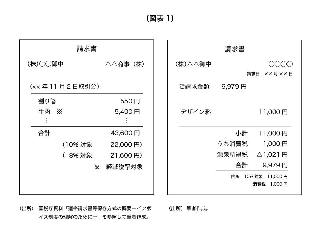 まず、一般的な請求書の記載項目についておさらいしましょう。以下の図表1の左側をご覧ください。もしあなたがフリーランスのクリエイターである場合には、図表1の右側のように、源泉所得税の金額も記載するケースが多いでしょう。