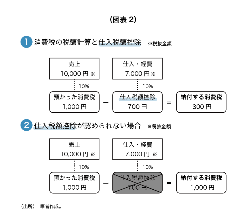 図表2①のように、消費税の納税義務がある課税事業者の場合、消費税の納税額は、売上に含まれる預かった消費税から、仕入や経費に含まれる支払った消費税を差し引いて計算します。この消費税の計算の仕組みを「仕入税額控除」といいます。