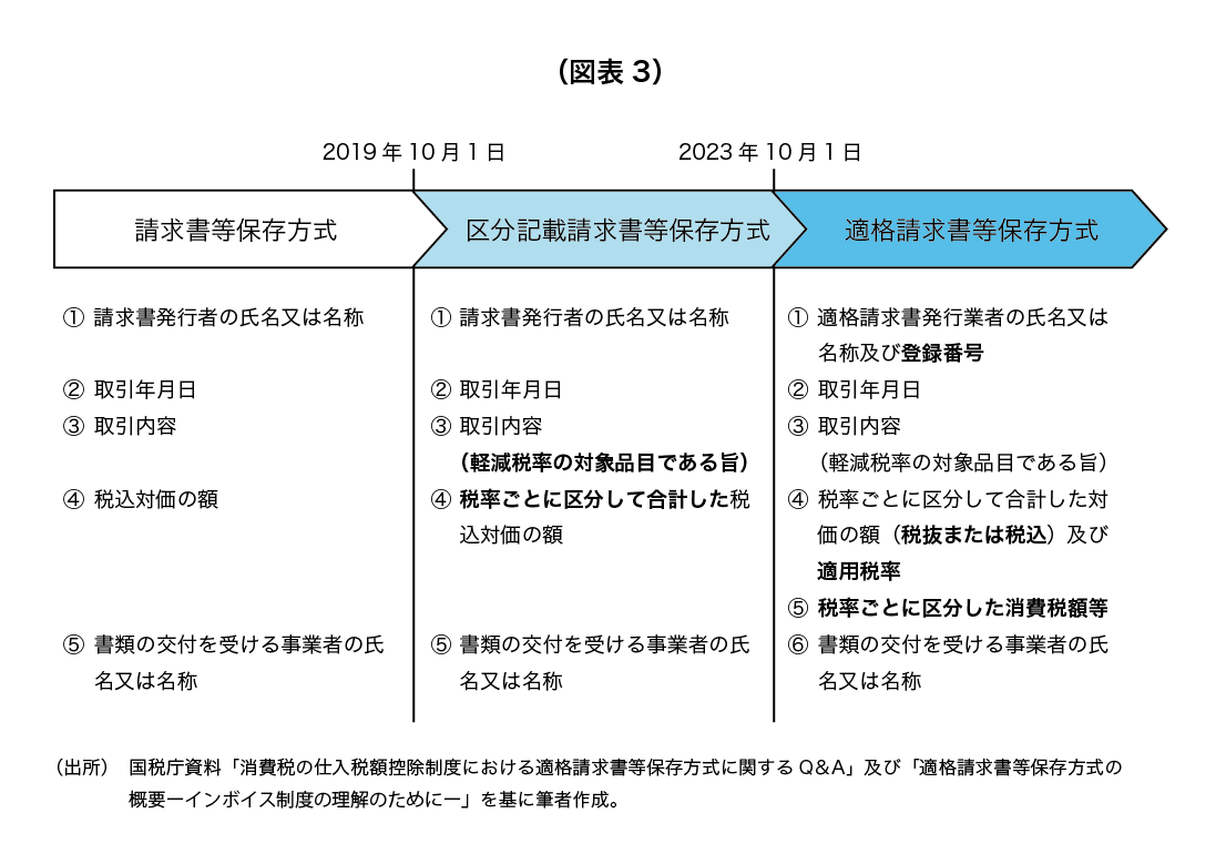 以下の図表3では、「仕入税額控除」が認められる請求書の記載項目と保存方式の変遷を示しています。2019年9月30日までは、「仕入税額控除」は一定の帳簿および請求書などの保存が要件とされてきました(請求書等保存方式)。軽減税率導入後の2019年10月1日から2023年9月30日までの間は、「仕入税額控除」の要件について、それまでの請求書等保存方式を基本的に維持しつつ、軽減税率の適用対象となる商品の仕入かそれ以外の仕入かの区別を明確にするための記載項目を追加した帳簿および請求書などの保存が要件となりました(区分記載請求書等保存方式)。