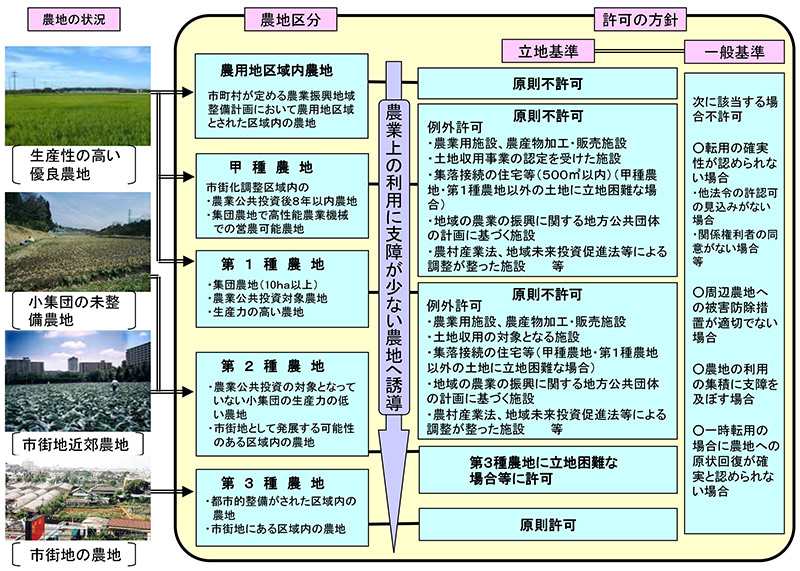 立地基準は、転用の許可を出すかどうかを判断する基準です。農地を次の5つに分けた上で検討します。