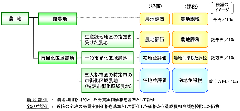 都市計画区域内の調整区域内の農地や生産緑地としての農地、都市計画外の農地のことです。長期にわたって農業を営むことが前提となっています。農業は宅地よりも活用余地がなく収益性が低いため、固定資産税評価額は「農地として利用する場合の売買価額」が基準となります。結果、評価額は宅地よりかなり低くなります。