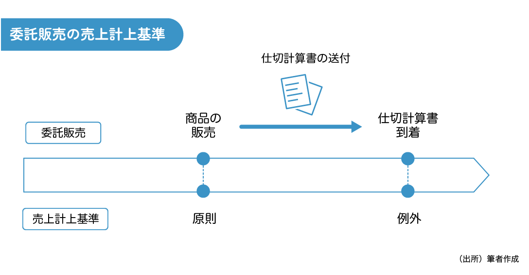 なお、委託販売では、受託者が委託品を「販売した日」に売上を計上するのが原則です。例外として、「仕切計算書が到着した日」に商品を販売したと「みなして」売上を計上することも実務上認められています。