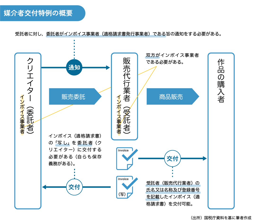 このうち「委託販売」とは、「業務を委託する事業者が媒介又は取次ぎに係る業務を行う者を介して行う課税資産の譲渡等」をいいます。つまり、クリエイターの作品の販売を代行してもらうことです。