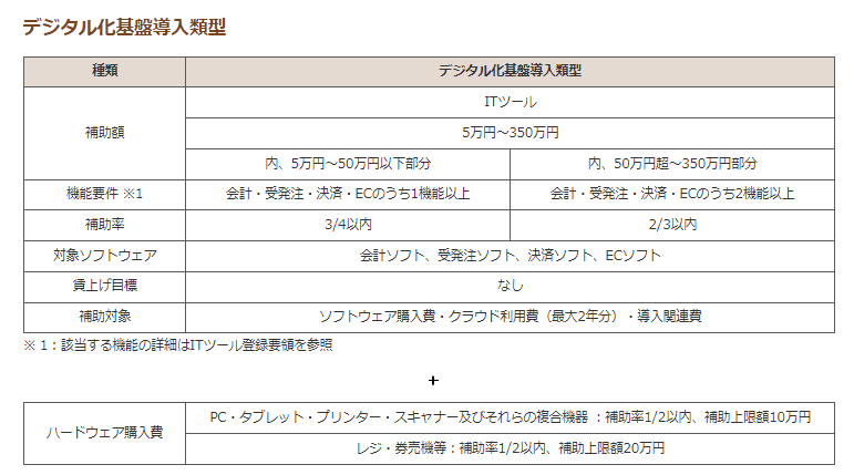 会計ソフトや決済システムなどのITツールの他、PC、タブレット、レジなどのデバイス購入費も対象です。なお、クラウド利用料については、最大2年分が補助されます。