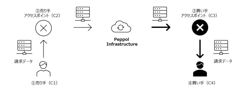 下図のように、ユーザー(売り手)(C1)は、自らのアクセスポイント(C2)を介してPeppolネットワークに接続し、買い手のアクセスポイント(C3)にインボイスデータセットを送信し、それが買い手(C4)に届くしくみとなっています。