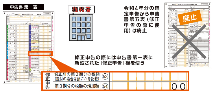 主にお勤めの方が還付申告などで利用していた「申告書A」が、令和4年分の確定申告から廃止されました。「申告書B」様式へと吸収・統合され、用紙の名称もA・Bの区分けなく「申告書」となります。また、「第五表(修正申告書)」も廃止されます。