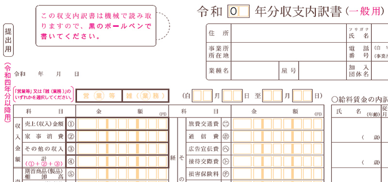 事業所得を申告する方が利用していた『収支内訳書』について様式が一部変更になりました。これは、令和4年分から雑所得について、前々年分の業務(副業)に係る「収入金額」が1,000万円を超えた場合、確定申告時に確定申告書とともに収支内訳書も提出しなければならなくなったことに対応するためです。