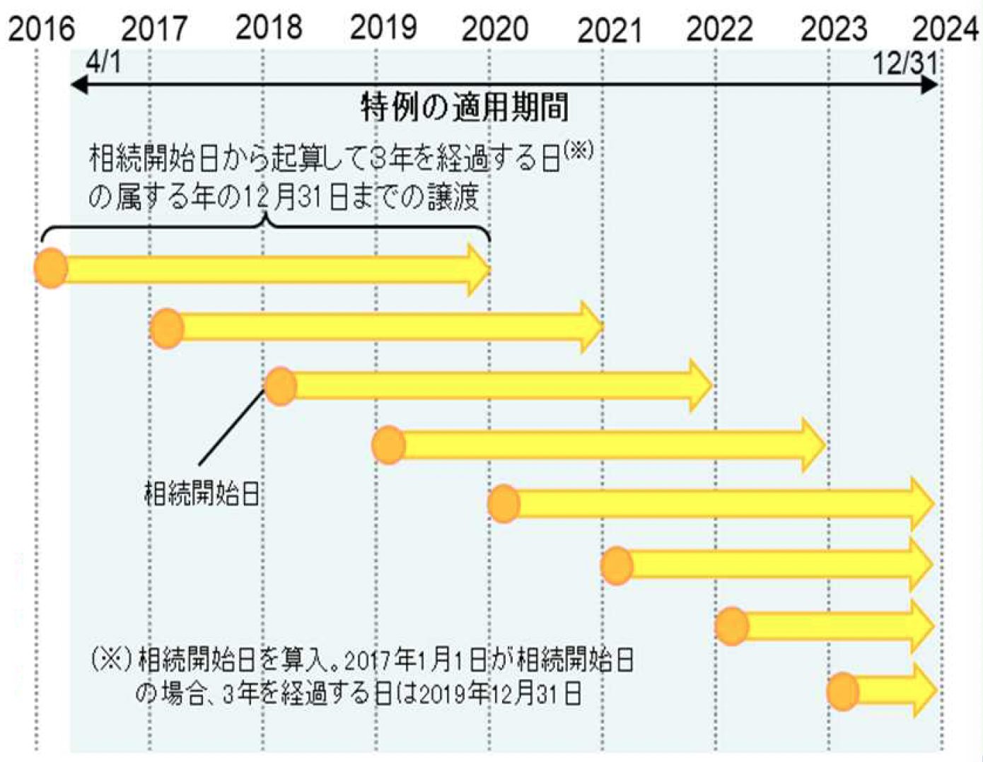 この特例措置は令和5年(2023年)12月31日が適用期限となっていましたが(下図)、2023年度税制改正大綱によれば、この適用期限が4年間延長される予定です。すなわち、特例措置の対象は令和9年(2027年)12月31日までの売却に延長されます。