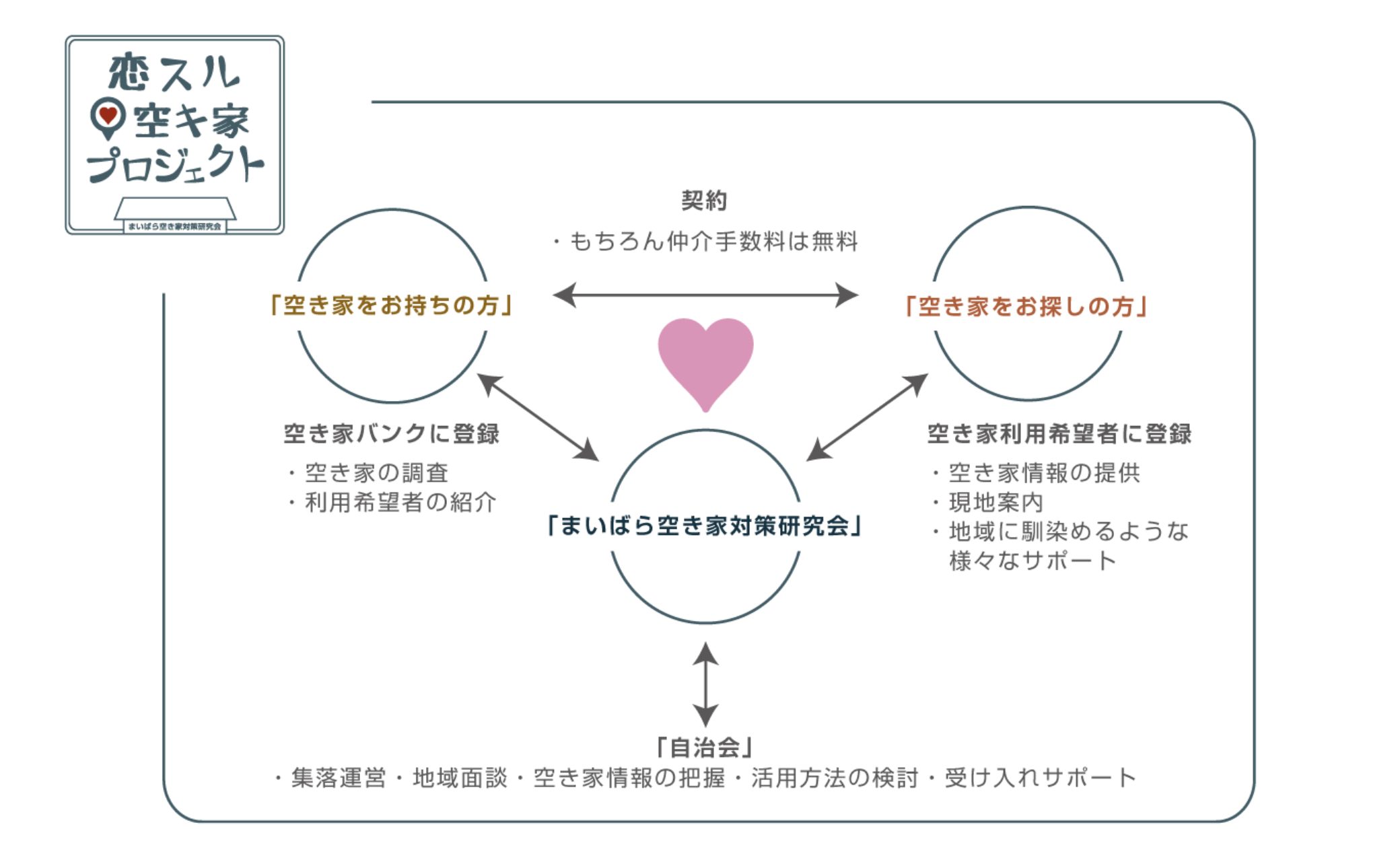 この点、営利を目的とする不動産業者などとは異なる立場から、社会的課題解決のための触媒的役割を担うことが多いのが、公益法人、NPO法人、自治会や任意団体といった非営利組織です。例えば、滋賀県米原市で発足した「まいばら空き家対策研究会―恋する空き家プロジェクト―」は、米原市の空き家を調査し、米原市への移住希望者と空き家物件をマッチングし紹介するという、空き家の買い手と売り手をつなぐ活動を行っています。