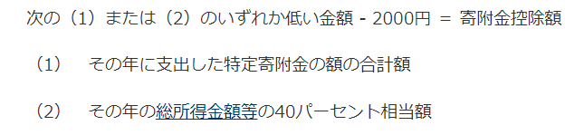自分で寄附金控除の額を計算して書き込まなくてはなりません。次の式で計算した金額を確定申告書の第一表「寄附金控除」の欄に記入します。