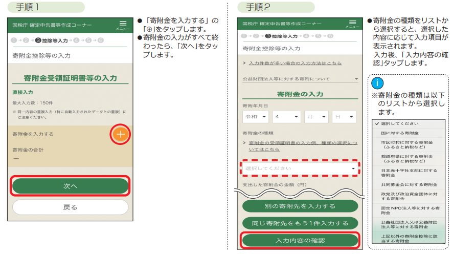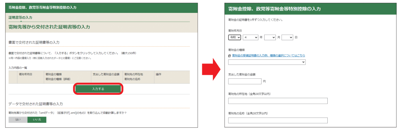 寄附金控除の画面で寄附先の自治体名や金額を入力すれば、自動的に計算されます。