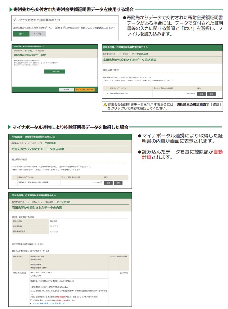「寄附先の自治体から寄附金受領証明書データをもらっている」「マイナポータル連携で控除証明書データを取得している」と言ったケースは、データ読み込みで入力を省略できます。