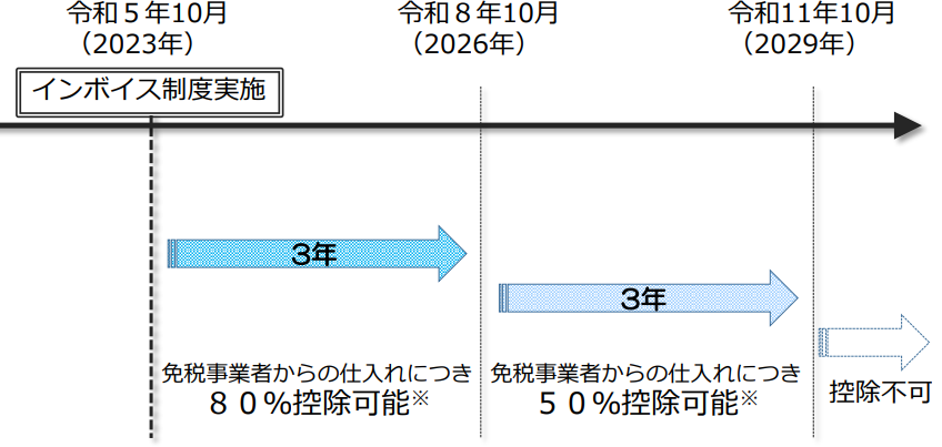 インボイス制度の開始にともなって設けられた経過措置の1つに「適格請求書発行事業者以外からの仕入でも消費税相当額の一部を仕入税額控除にできる」制度があります。控除できる割合と期間は、次の通りです。