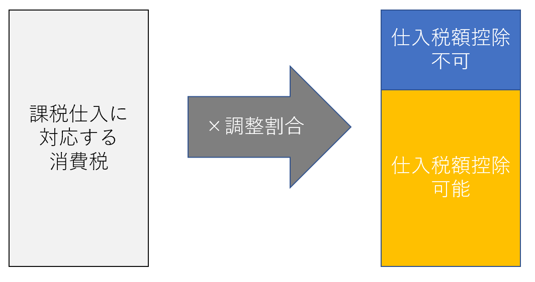 例えば、課税仕入に対応する消費税が500万円で調整割合が20%である場合には、500万円のうち20%の100万円は仕入税額控除の対象外となり、仕入税額控除の対象となるのは400万円ということになります。