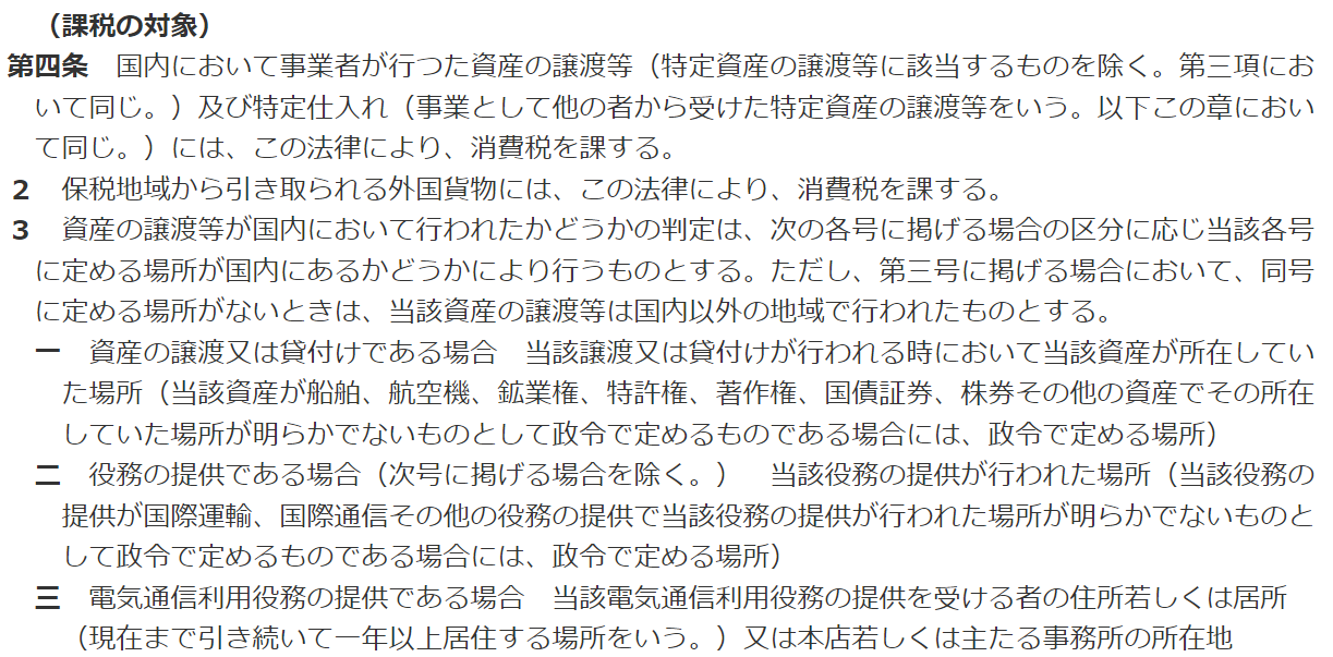 第4条第1項の「国内で行われた資産の譲渡等(国内取引)」と同条第2項の「保税地域からの引き取り(輸入取引)」、そして同上第3項第3号の「電気通信利用役務の提供を(事業者が)利用したとき(特定仕入れ)」に消費税がかかります。