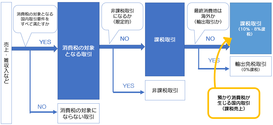 上記のすべてに当てはまるものが、消費税の対象となる国内取引です。この4つに当てはまる売上や雑収入は、基本的に「預かり消費税が発生する可能性がある」と考えていいでしょう。