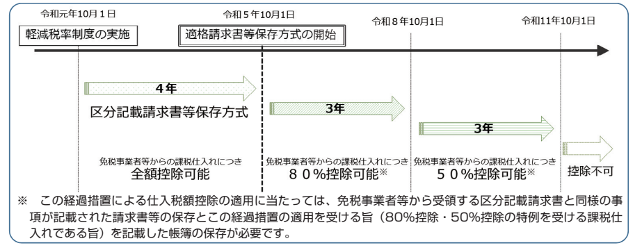 令和5年10月から3年間は仕入に係る消費税に相当する金額の80%を控除。そして、その後令和8年10月から3年間は仕入に係る消費税額に相当する額の50%を控除できます。合計6年間の経過措置の期間を経た令和11年10月以降は、全額仕入税額控除できなくなります。