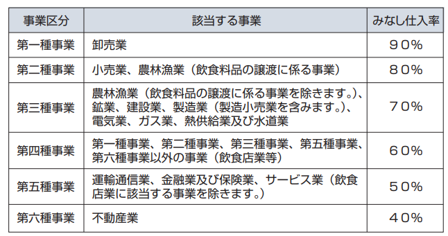 簡易課税制度における業種ごとのみなし仕入率は以下の通りです。