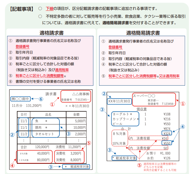 インボイスでは「取引内容(軽減税率の対象品目である旨)」を記載する必要があります。