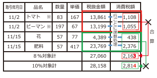 この請求書では、軽減8%の商品の税抜金額を合計して、合計した税抜金額に8%をかけて税率8%分の消費税額を計算。同様に、10%の商品の税抜金額を合計して、合計した税抜金額に税率10%をかけて税率10%分の消費税額を計算しています。