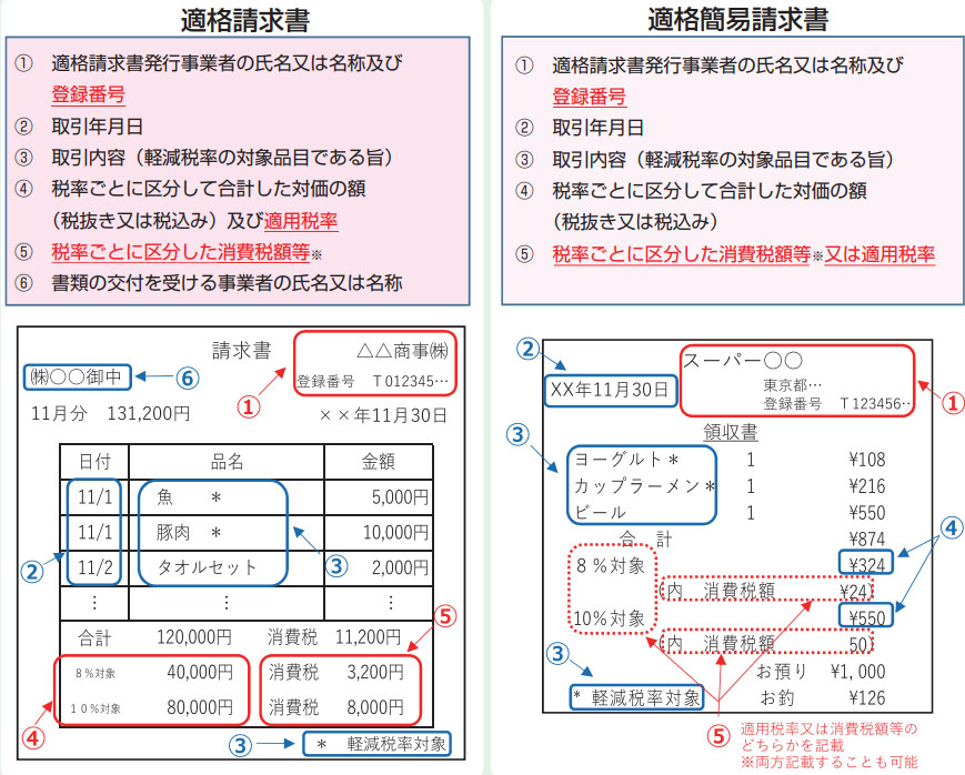 心配なのが「仕入税額控除」です。本則課税(原則課税・一般課税)の課税事業者は、仕入先や外注先からもらったインボイスがあって初めて仮払いした消費税を差し引けます。インボイスは下記の通り、登録番号が書かれていることが条件です。